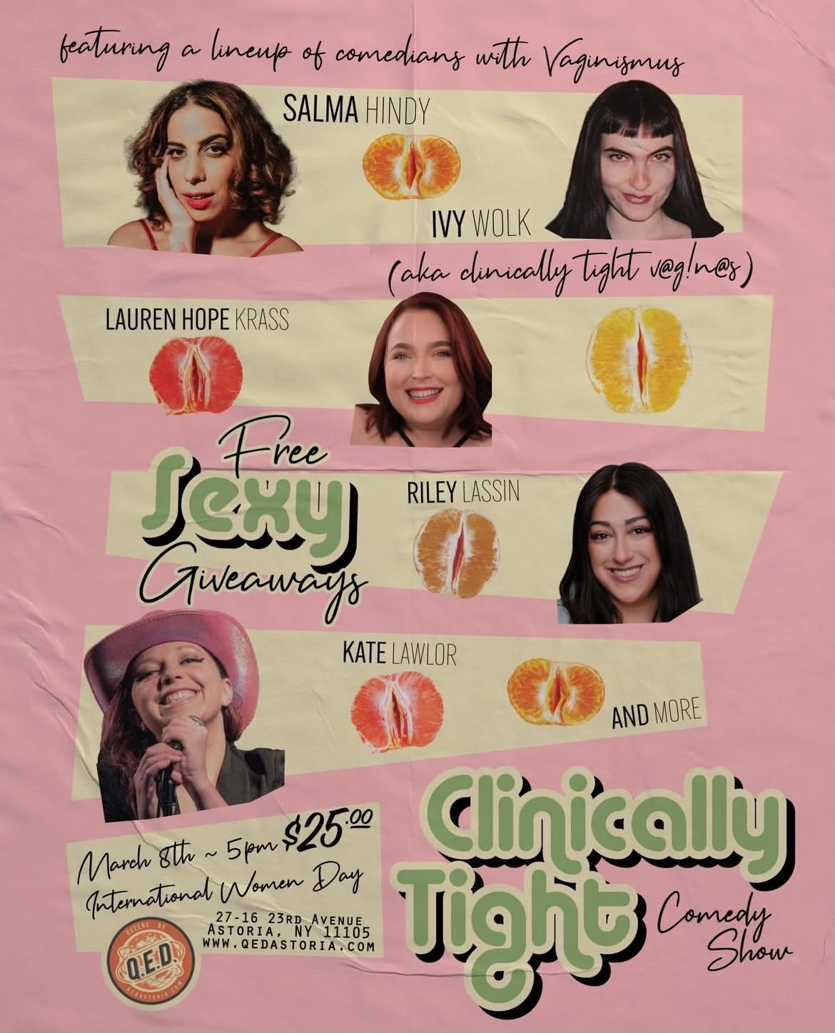 Imagine my shock seeing the above poster for Clinically Tight, a comedy show featuring a lineup of comedians with vaginismus. It felt significant for two reasons, the first of which being that I removed the phrase “Clinically Tight” from my social media bios in 2023, as I noted in my post about learning from the vaginismus community. The second reason was simple, as the mere existence of the poster implied that somewhere, there were going to be people who care about vaginismus gathered in a room.