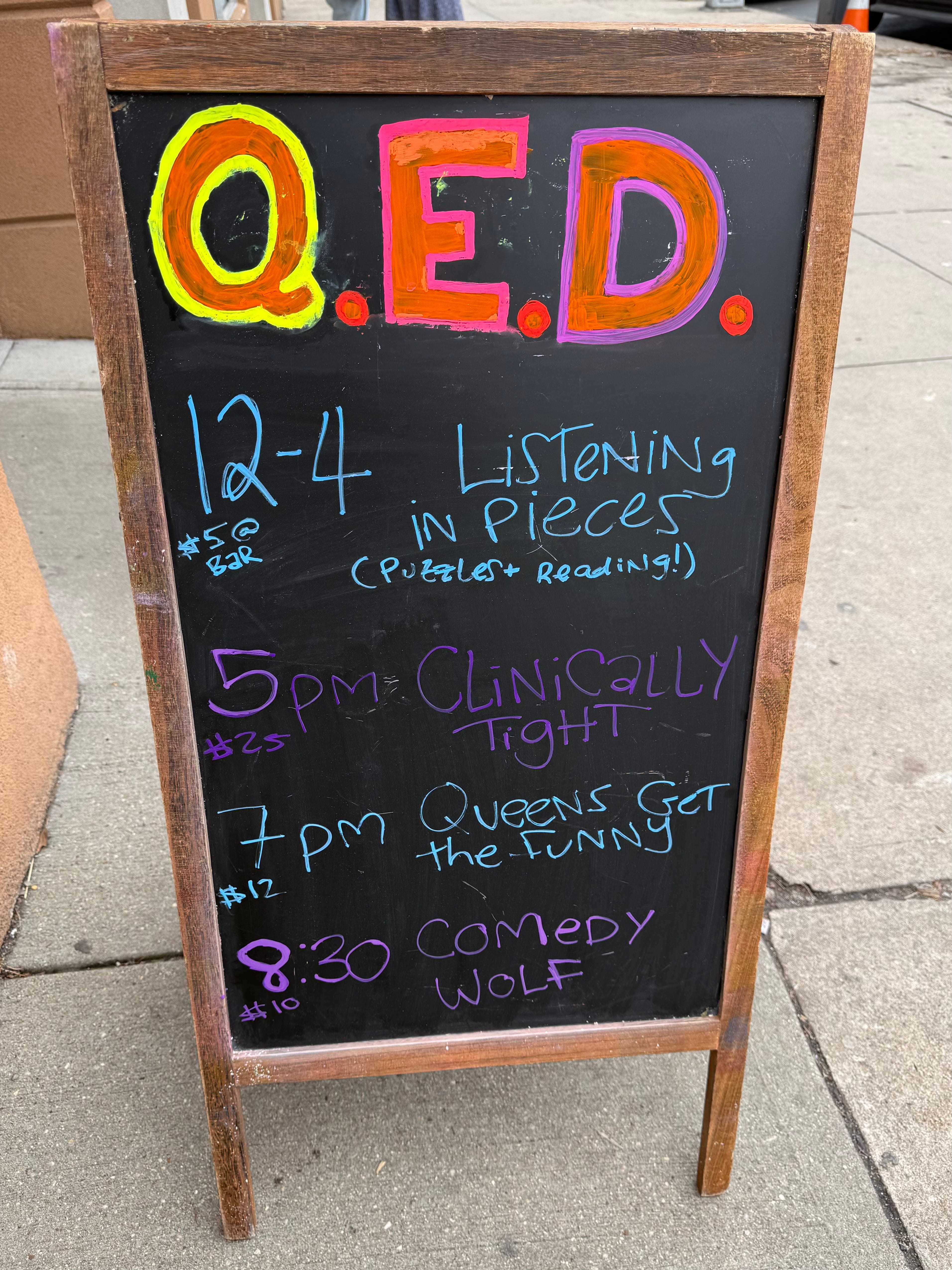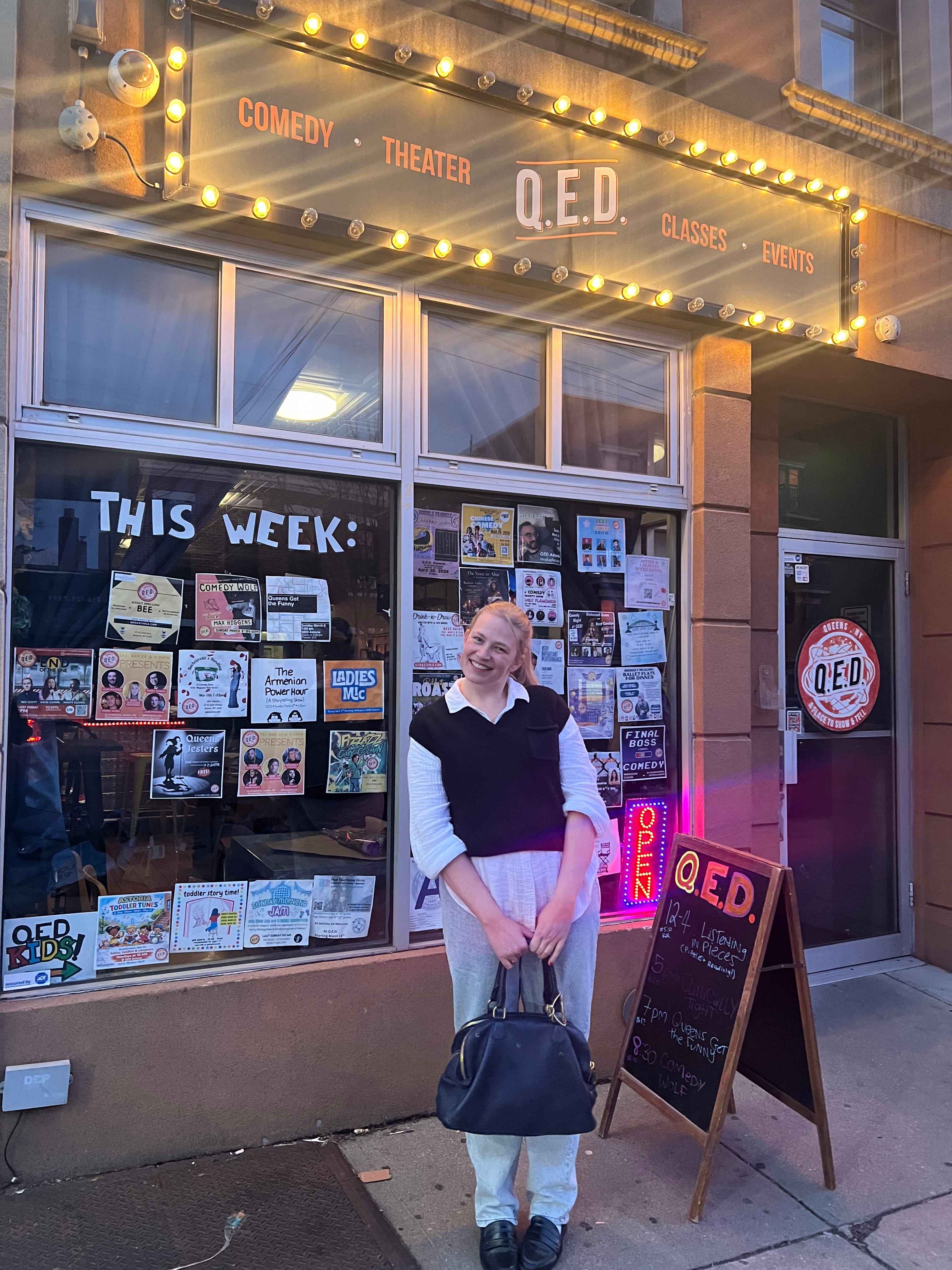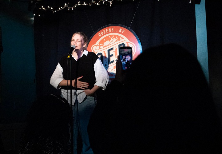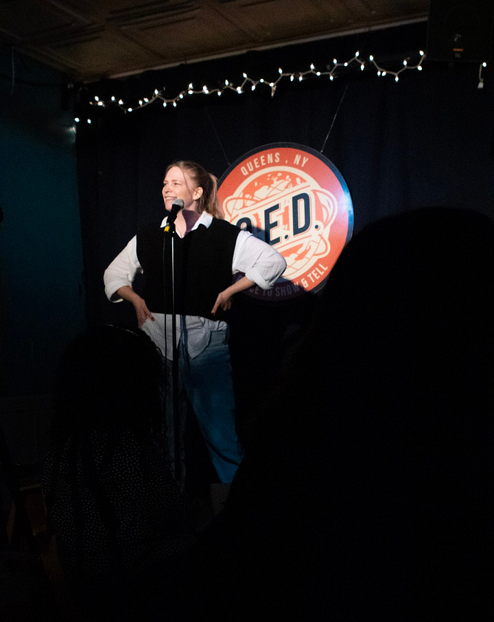 I arrived early to the venue because of course I did, and spent a solid half hour listening to affirmations in my headphones and taking deep breaths. A photo slideshow of AOC, Kate McKinnon, and Pete Davidson standing on the Q.E.D. stage played onscreen above my head. I watched as the room filled up with comedians, then my mom and sister who I’d left on a nearby street corner an hour prior, and then that coveted audience. My nerves started to subside. After all, I came for them.